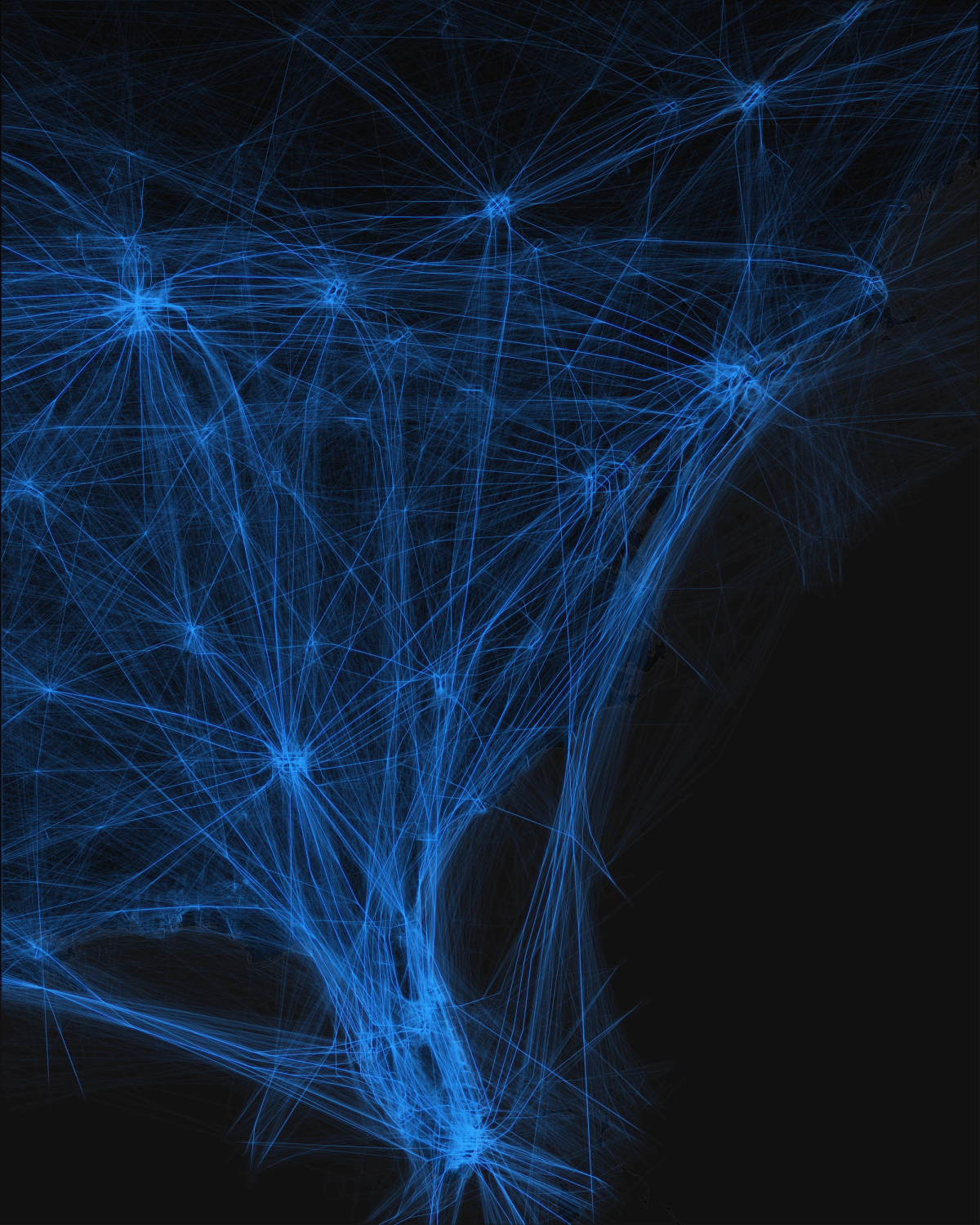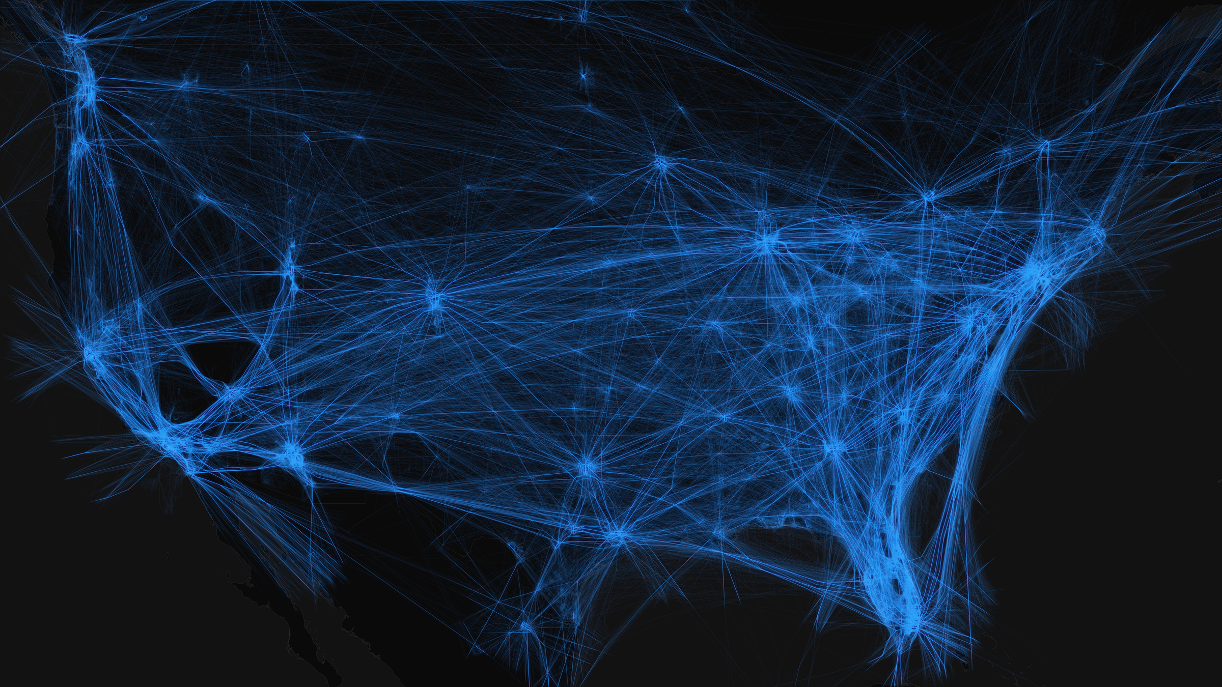 The visualization shows the aviation network at full capacity: dense activity patterns around Atlanta, Dallas-Fort Worth, and Chicago, transcontinental routes connecting the coasts, and that familiar spider-web of connections that makes American aviation work.